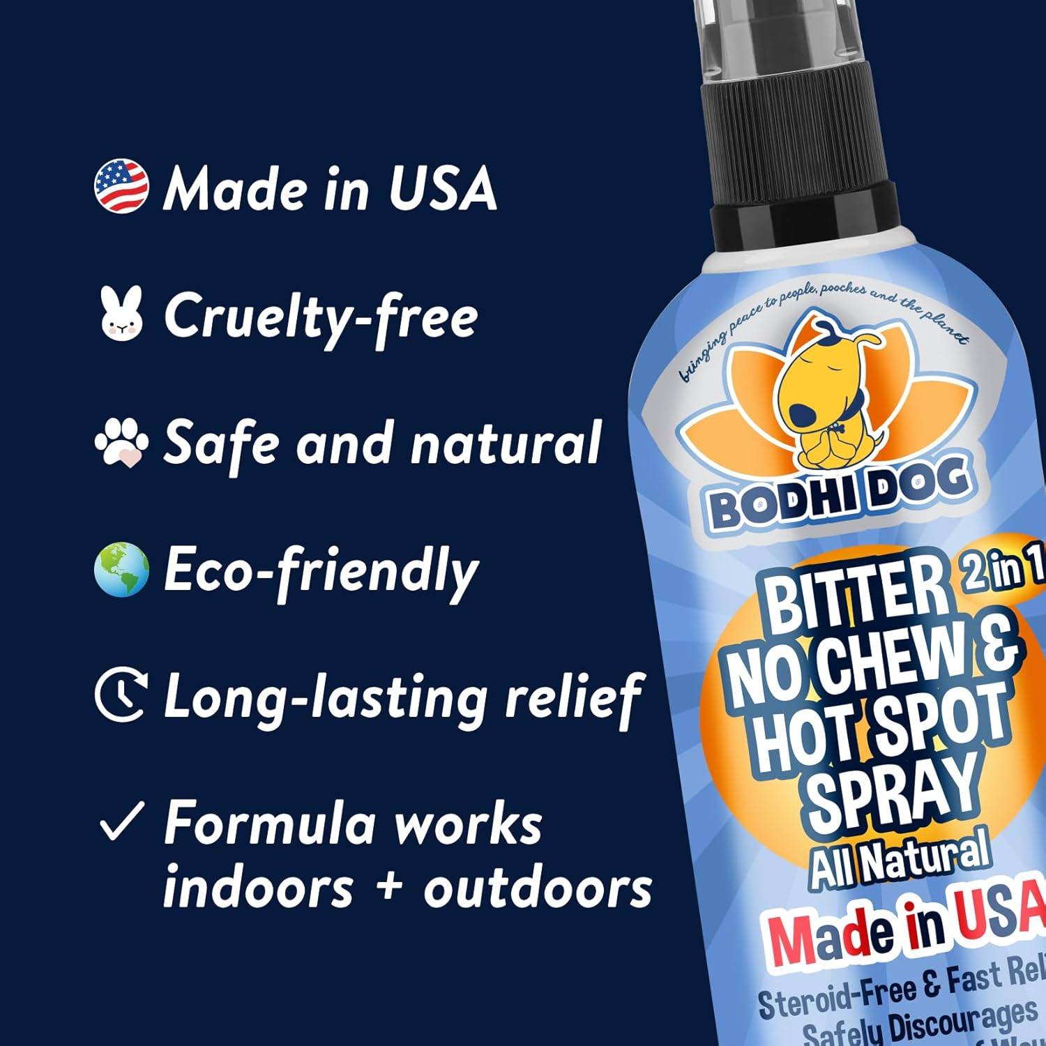 Our Ethical Family Commitment: Proudly made in the USA using socially responsible practices, locally sourced and sustainable ingredients, animal cruelty-free production and eco-friendly recyclable packaging. If you don’t love our Bitter 2 in 1 No Chew & Hot Spot Spray, let us know and receive a full, no questions asked refund. We are a small family-owned business of pet lovers committed to making great products that are safe for you, your pets and the planet!