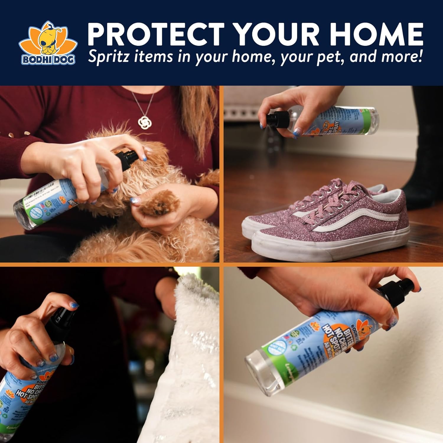Bodhi Dog is a small, family owned business based in the USA and our cruelty-free formula sources premium local ingredients that are loved by trainers and pet parents alike. Our spray is water safe and won’t stain fabrics. Test on a small inconspicuous area first to double check!